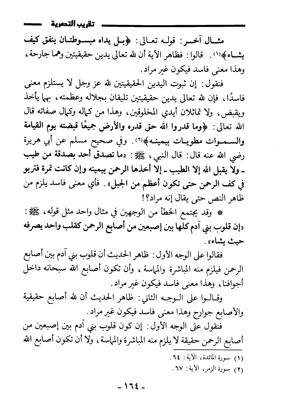 فنقول: إن ثبوت اليدين الحقيقيتين لله عز وجل لا يستلزم معنى فاسدا، فإن لله تعالى يدين حقيقيتين تليقان بجلاله وعظمته، بهما يأخذ ويقبض، ولا تماثلان أيدي المخلوقين، وهذا من كماله وكمال صفاته قال الله تعالى: {وَمَا قَدَرُوا اللَّهَ حَقَّ قَدْرِهِ وَالْأَرْضُ جَمِيعًا قَبْضَتُهُ يَوْمَ الْقِيَامَةِ وَالسَّماوَاتُ مَطْوِيَّاتٌ بِيَمِينِهِ} . وفي صحيح مسلم عن أبي هريرة رضي الله عنه قال: قال النبي صَلَّى اللَّهُ عَلَيْهِ وَسَلَّمَ: «ما تصدق أحد بصدقة من طيب - ولا يقبل الله إلا الطيب - إلا أخذها الرحمن بيمينه وإن كانت تمرة فتربو في كف الرحمن حتى تكون أعظم من الجبل» فأي معنى فاسد يلزم من ظاهر النص حتى يقال: إنه غير مراد؟ !