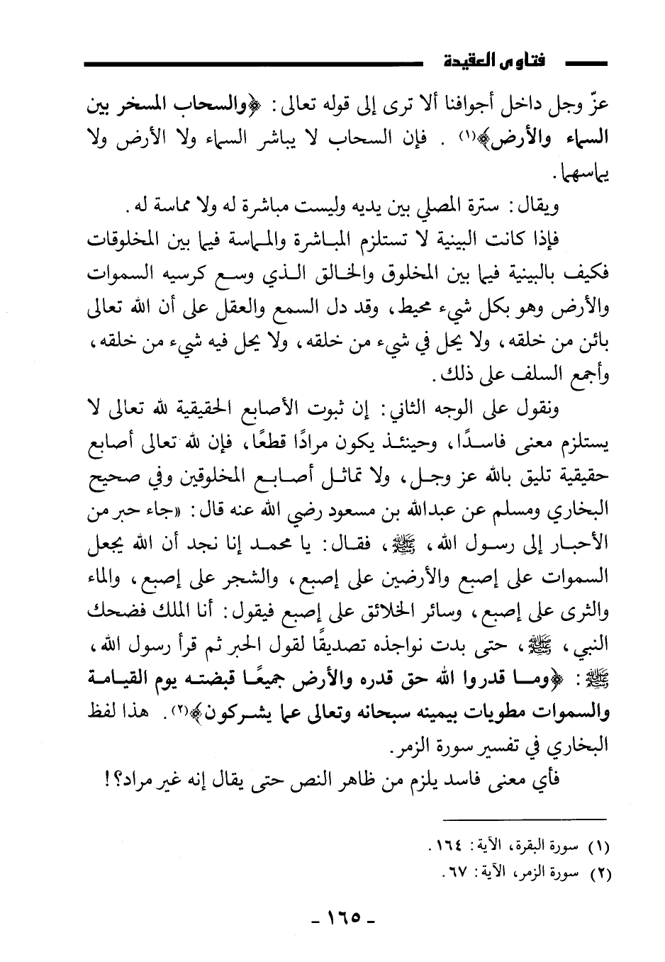 ونقول على الوجه الثاني: إن ثبوت الأصابع الحقيقية لله تعالى لا يستلزم معنى فاسدا، وحينئذ يكون مرادا قطعا، فإن لله تعالى أصابع حقيقية تليق بالله عز وجل، ولا تماثل أصابع المخلوقين وفي صحيح البخاري ومسلم عن عبد الله بن مسعود رضي الله عنه قال: «جاء حبر من الأحبار إلى رسول الله صَلَّى اللَّهُ عَلَيْهِ وَسَلَّمَ فقال: يا محمد إنا نجد أن الله يجعل السماوات على إصبع والأرضين على إصبع، والشجر على إصبع، والماء والثرى على إصبع، وسائر الخلائق على إصبع فيقول: أنا الملك فضحك النبي صَلَّى اللَّهُ عَلَيْهِ وَسَلَّمَ حتى بدت نواجذه تصديقا لقول الحبر ثم قرأ رسول الله صَلَّى اللَّهُ عَلَيْهِ وَسَلَّمَ: {وَمَا قَدَرُوا اللَّهَ حَقَّ قَدْرِهِ وَالْأَرْضُ جَمِيعًا قَبْضَتُهُ يَوْمَ الْقِيَامَةِ وَالسَّماوَاتُ مَطْوِيَّاتٌ بِيَمِينِهِ سُبْحَانَهُ وَتَعَالَى عَمَّا يُشْرِكُونَ} » . هذا لفظ البخاري في تفسير سورة الزمر.