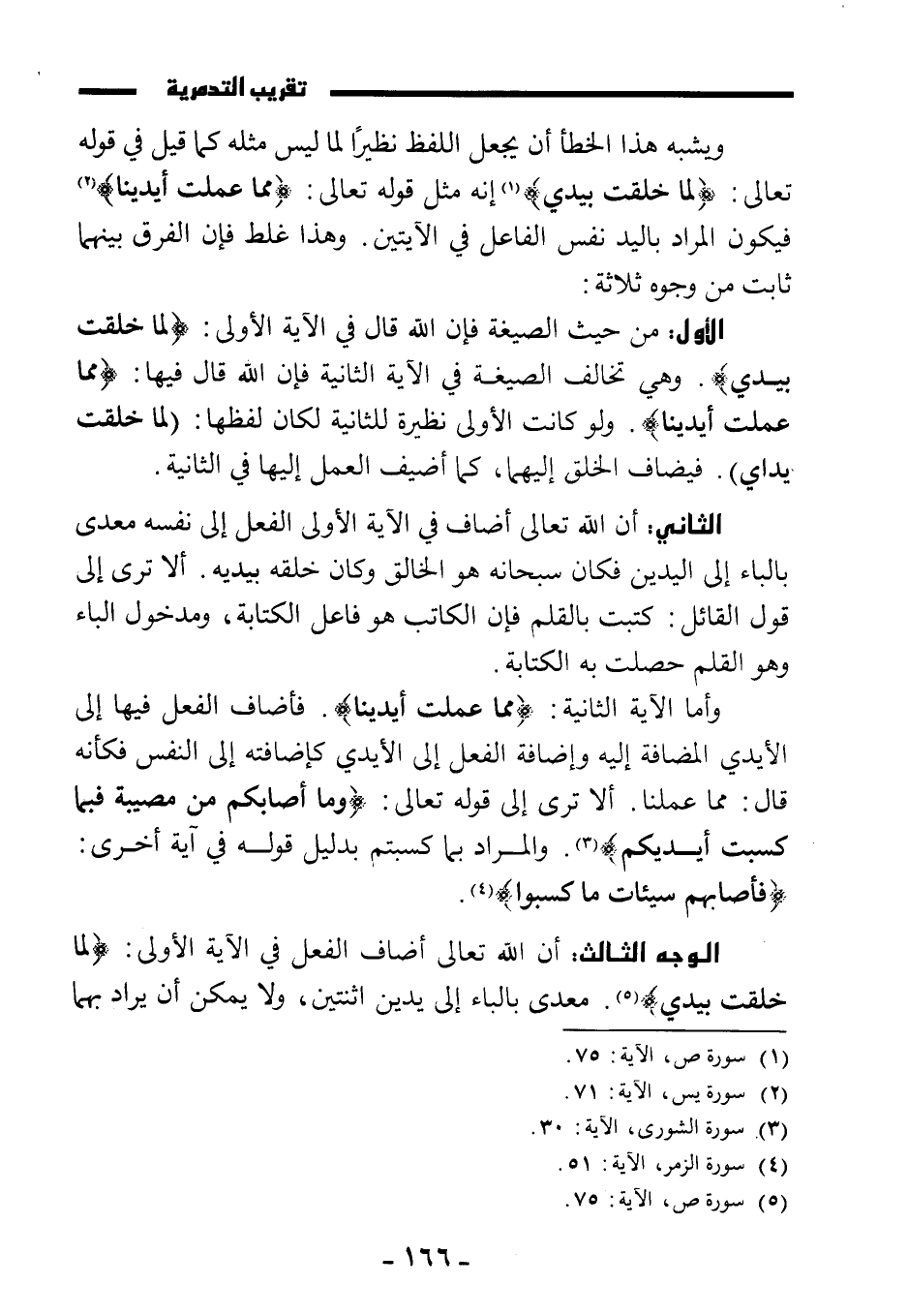 الأول: من حيث الصيغة فإن الله قال في الآية الأولى: {لِمَا خَلَقْتُ بِيَدَيَّ} وهي تخالف الصيغة في الآية الثانية فإن الله قال فيها: {مِمَّا عَمِلَتْ أَيْدِينَا} . ولو كانت الأولى نظيرة للثانية لكان لفظها: (لما خلقت يداي) فيضاف الخلق إليهما، كما أضيف العمل إليها في الثانية.