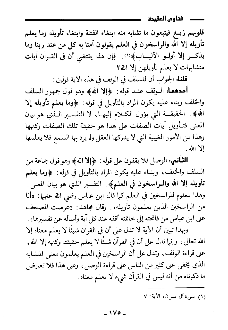 الثاني: الوصل فلا يقفون على قوله: {إِلَّا اللَّهُ} وهو قول جماعة من السلف والخلف، وبناء عليه يكون المراد بالتأويل في قوله: {وَمَا يَعْلَمُ تَأْوِيلَهُ إِلَّا اللَّهُ وَالرَّاسِخُونَ فِي الْعِلْمِ} . التفسير الذي هو بيان المعنى. وهذا معلوم للراسخين في العلم كما قال ابن عباس رضي الله عنهما: " أنا من الراسخين الذين يعلمون تأويله". وقال مجاهد: " عرضت المصحف على ابن عباس من فاتحته إلى خاتمته أقفه عند كل آية وأسأله عن تفسيرها".
