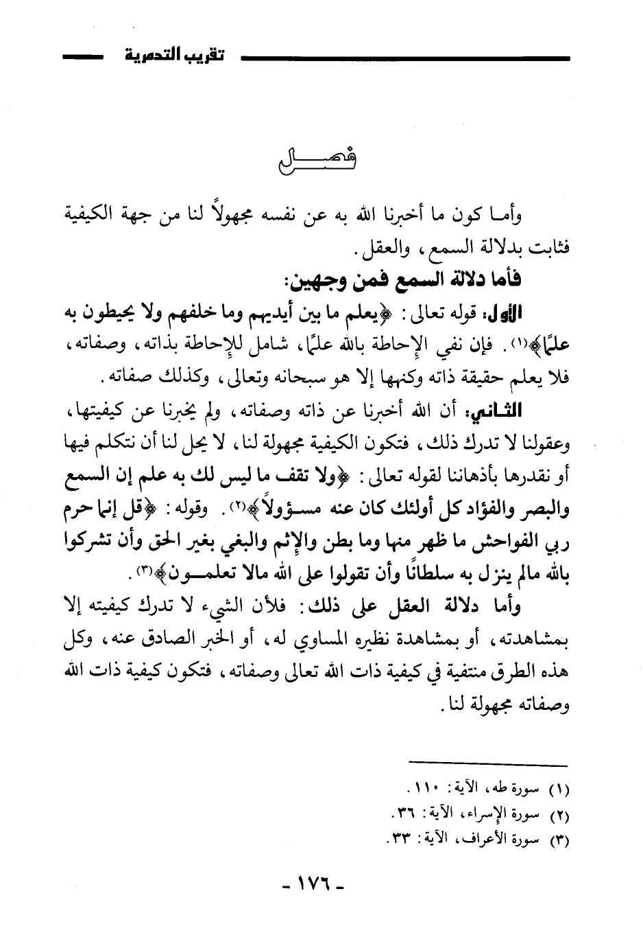 الثاني: أن الله أخبرنا عن ذاته وصفاته، ولم يخبرنا عن كيفيتها، وعقولنا لا تدرك ذلك، فتكون الكيفية مجهولة لنا، لا يحل لنا أن نتكلم فيها أو نقدرها بأذهاننا لقوله تعالى: {وَلَا تَقْفُ مَا لَيْسَ لَكَ بِهِ عِلْمٌ إِنَّ السَّمْعَ وَالْبَصَرَ وَالْفُؤَادَ كُلُّ أُولَئِكَ كَانَ عَنْهُ مَسْئُولًا} . وقوله: {قُلْ إِنَّمَا حَرَّمَ رَبِّيَ الْفَوَاحِشَ مَا ظَهَرَ مِنْهَا وَمَا بَطَنَ وَالْإِثْمَ وَالْبَغْيَ بِغَيْرِ الْحَقِّ وَأَنْ تُشْرِكُوا بِاللَّهِ مَا لَمْ يُنَزِّلْ بِهِ سُلْطَانًا وَأَنْ تَقُولُوا عَلَى اللَّهِ مَا لَا تَعْلَمُونَ} .