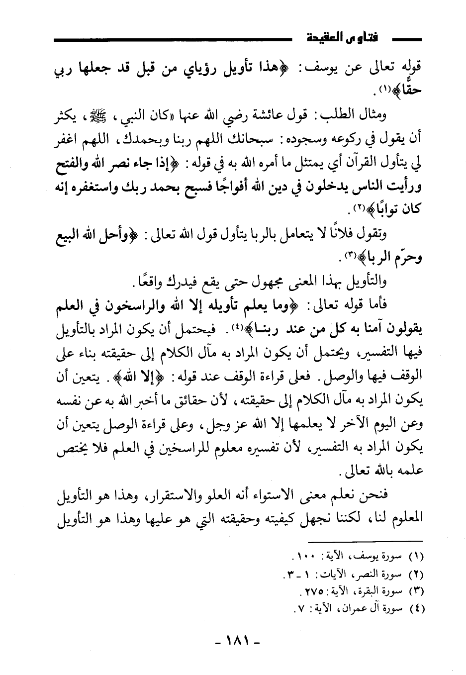 فنحن نعلم معنى الاستواء أنه العلو والاستقرار، وهذا هو التأويل المعلوم لنا، لكننا نجهل كيفيته وحقيقته التي هو عليها وهذا هو التأويل