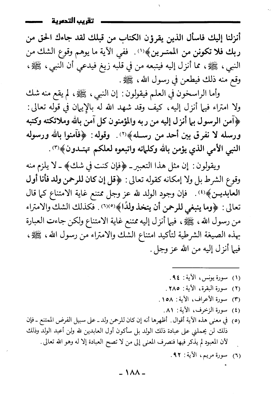 {فَإِنْ كُنْتَ فِي شَكٍّ مِمَّا أَنْزَلْنَا إِلَيْكَ فَاسْأَلِ الَّذِينَ يَقْرَءُونَ الْكِتَابَ مِنْ قَبْلِكَ لَقَدْ جَاءَكَ الْحَقُّ مِنْ رَبِّكَ فَلَا تَكُونَنَّ مِنَ الْمُمْتَرِينَ} . ففي الآية ما يوهم وقوع الشك من النبي صَلَّى اللَّهُ عَلَيْهِ وَسَلَّمَ مما أنزل إليه فيتبعه من في قلبه زيغ فيدعي أن النبي صَلَّى اللَّهُ عَلَيْهِ وَسَلَّمَ وقع منه ذلك فيطعن في رسول الله صَلَّى اللَّهُ عَلَيْهِ وَسَلَّمَ.