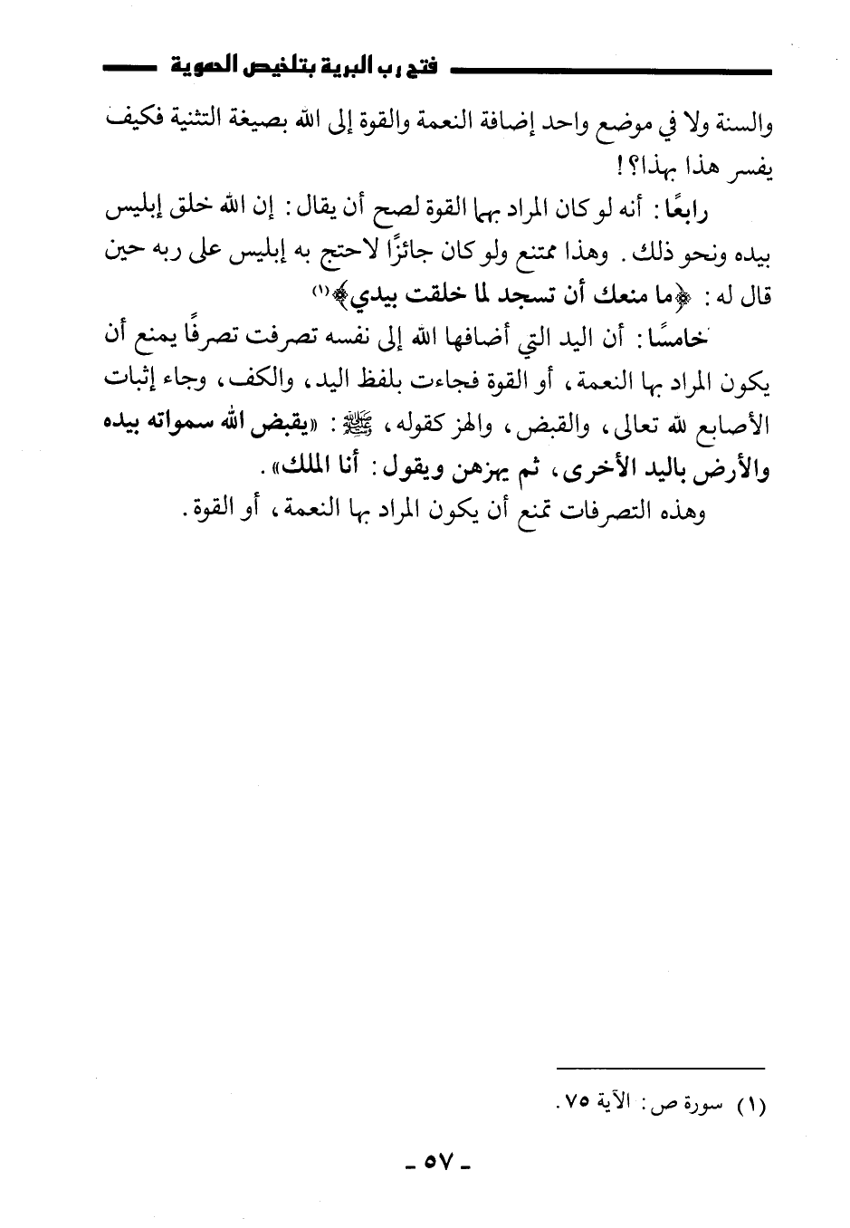 رابعا: أنه لو كان المراد بهما القوة لصح أن يقال: إن الله خلق إبليس بيده ونحو ذلك. وهذا ممتنع ولو كان جائزا لاحتج به إبليس على ربه حين قال له: {مَا مَنَعَكَ أَنْ تَسْجُدَ لِمَا خَلَقْتُ بِيَدَيَّ} .