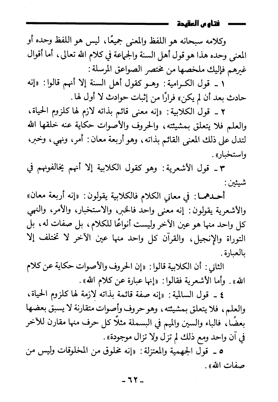وكلامه سبحانه هو اللفظ والمعنى جميعا، ليس هو اللفظ وحده أو المعنى وحده، هذا هو قول أهل السنة والجماعة في كلام الله تعالى، أما أقوال غيرهم فإليك ملخصها من مختصر الصواعق المرسلة: