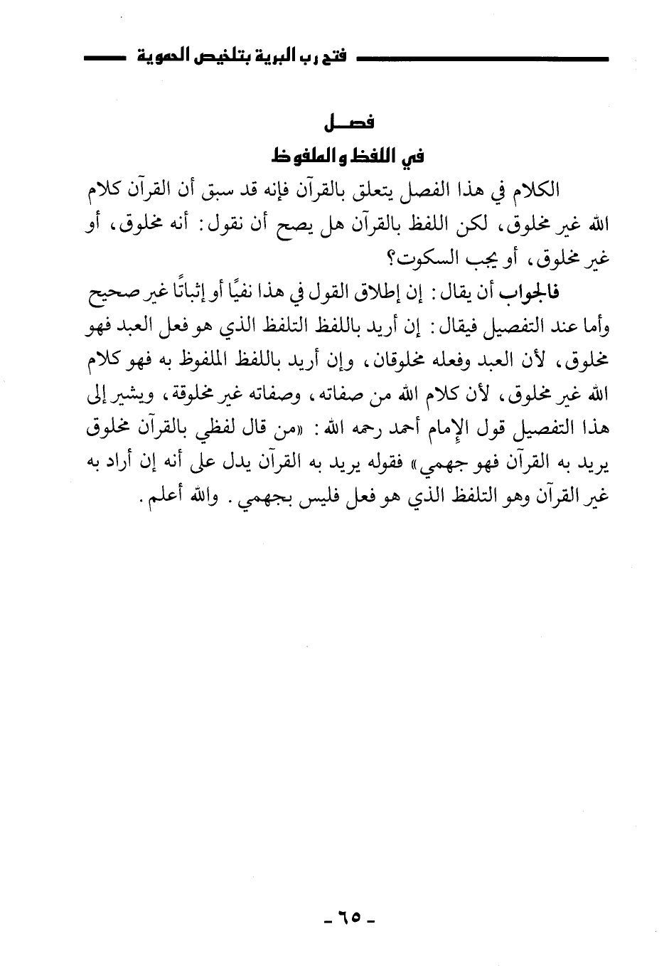 الكلام في هذا الفصل يتعلق بالقرآن فإنه قد سبق أن القرآن كلام الله غير مخلوق، لكن اللفظ بالقرآن هل يصح أن نقول: أنه مخلوق، أو غير مخلوق، أو يجب السكوت؟