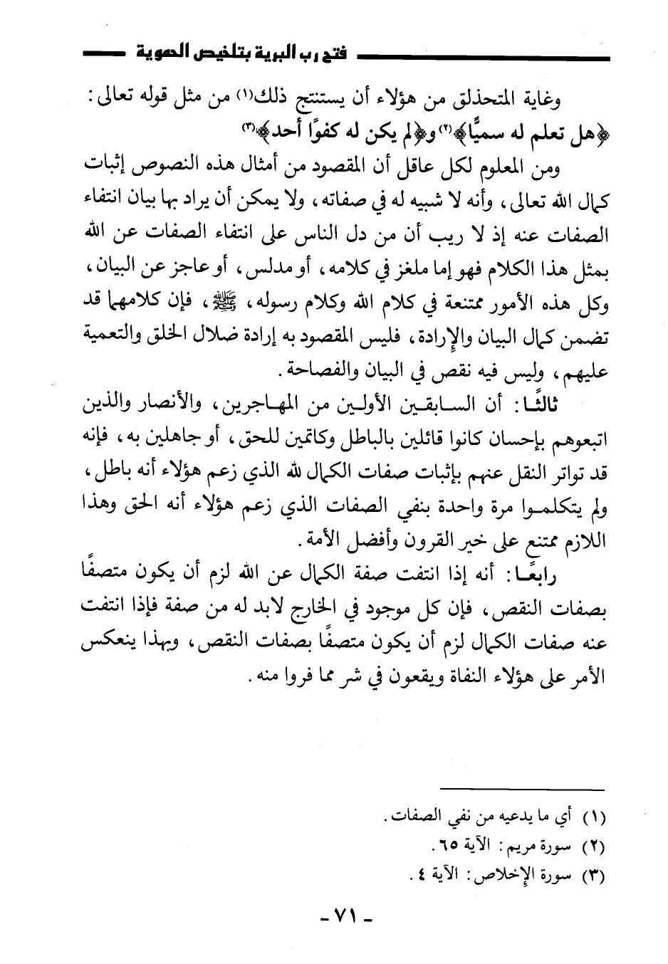 ومن المعلوم لكل عاقل أن المقصود من أمثال هذه النصوص إثبات كمال الله تعالى، وأنه لا شبيه له في صفاته، ولا يمكن أن يراد بها بيان انتفاء الصفات عنه إذ لا ريب أن من دل الناس على انتفاء الصفات عن الله بمثل هذا الكلام فهو إما ملغز في كلامه، أو مدلس، أو عاجز عن البيان، وكل هذه الأمور ممتنعة في كلام الله وكلام رسوله صَلَّى اللَّهُ عَلَيْهِ وَسَلَّمَ، فإن كلامهما قد تضمن كمال البيان والإرادة، فليس المقصود به إرادة ضلال الخلق والتعمية عليهم، وليس فيه نقص في البيان والفصاحة.