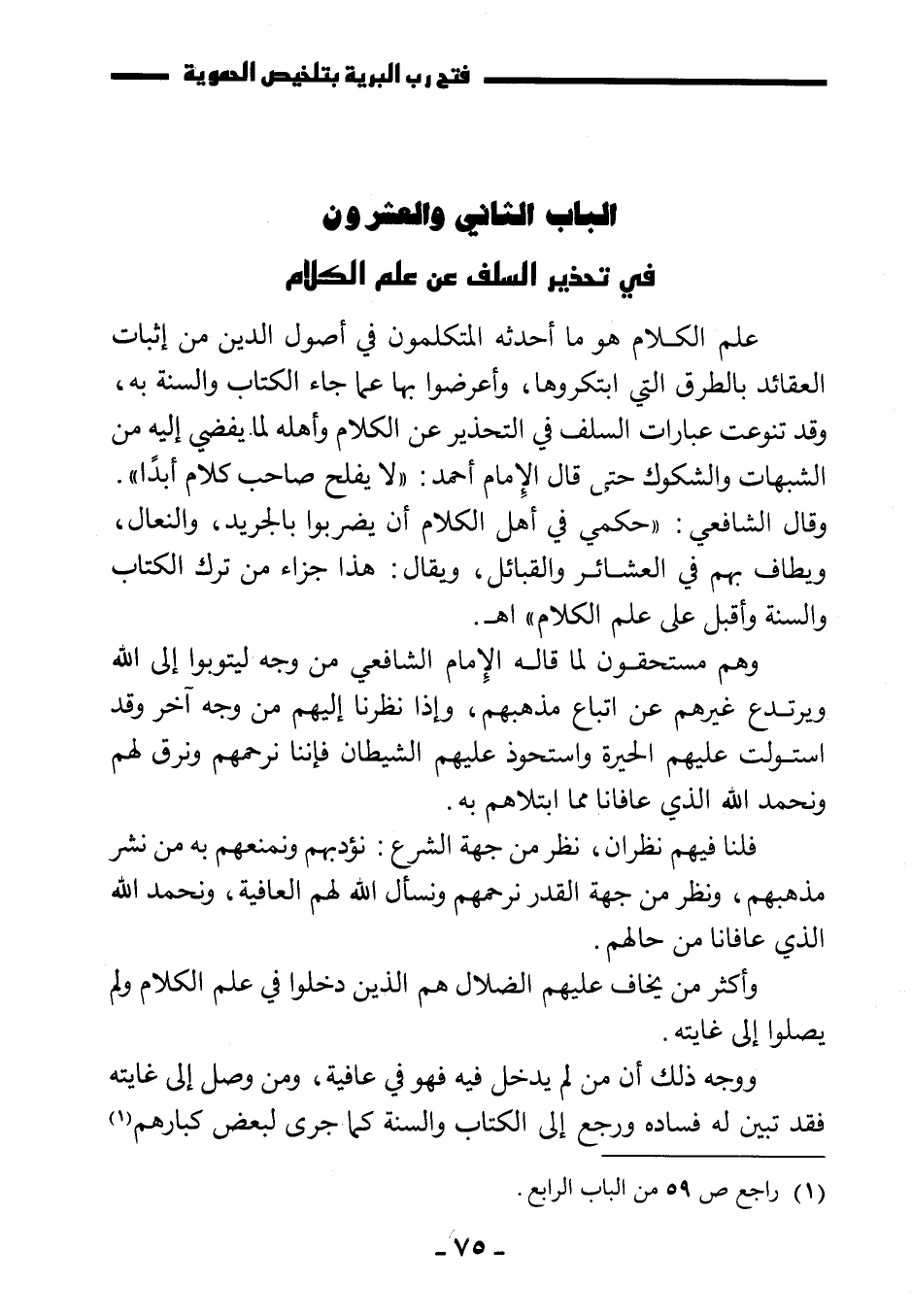 علم الكلام هو ما أحدثه المتكلمون في أصول الدين من إثبات العقائد بالطرق التي ابتكروها، وأعرضوا بها عما جاء الكتاب والسنة به، وقد تنوعت عبارات السلف في التحذير عن الكلام وأهله لما يفضي إليه من الشبهات والشكوك حتى قال الإمام أحمد: " لا يفلح صاحب كلام أبدا".