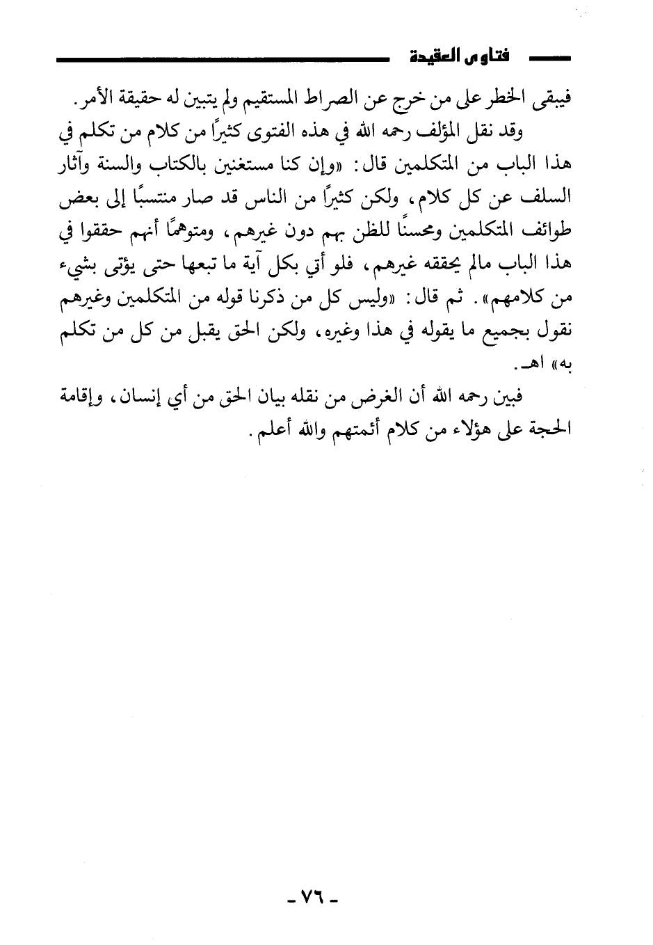 وقد نقل المؤلف رحمه الله في هذه الفتوى كثيرا من كلام من تكلم في هذا الباب من المتكلمين قال: " وإن كنا مستغنين بالكتاب والسنة وآثار السلف عن كل كلام، ولكن كثيرا من الناس قد صار منتسبا إلى بعض طوائف المتكلمين ومحسنا للظن بهم دون غيرهم، ومتوهما أنهم حققوا في هذا الباب ما لم يحققه غيرهم، فلو أتي بكل آية ما تبعها حتى يؤتى بشيء من كلامهم". ثم قال: " وليس كل من ذكرنا قوله من المتكلمين وغيرهم نقول بجميع ما يقوله في هذا وغيره، ولكن الحق يقبل من كل من تكلم به" اهـ.