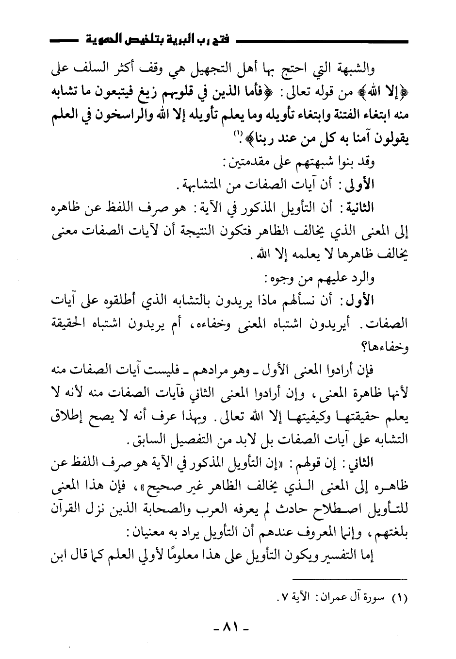 الأول: أن نسألهم ماذا يريدون بالتشابه الذي أطلقوه على آيات الصفات. أيريدون اشتباه المعنى وخفاءه، أم يريدون اشتباه الحقيقة وخفاءها؟
