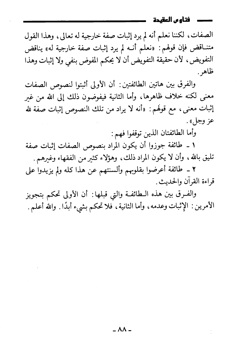 الصفات، لكننا نعلم أنه لم يرد إثبات صفة خارجية له تعالى، وهذا القول متناقض فإن قولهم: " نعلم أنه لم يرد إثبات صفة خارجية له" يناقض التفويض، لأن حقيقة التفويض أن لا يحكم المفوض بنفي ولا إثبات وهذا ظاهر.