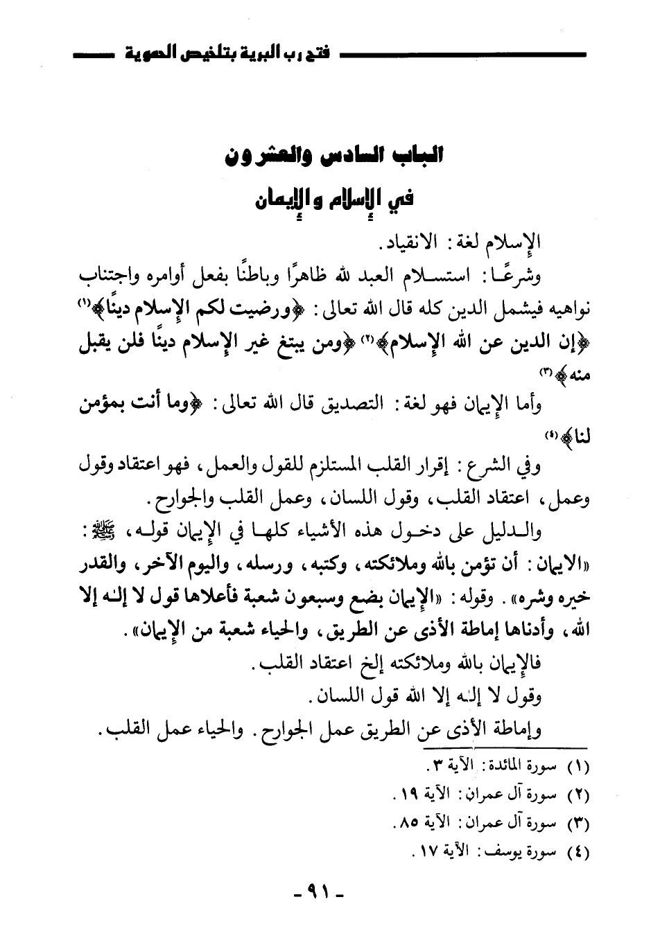 والدليل على دخول هذه الأشياء كلها في الإيمان قوله صَلَّى اللَّهُ عَلَيْهِ وَسَلَّمَ: «الإيمان: أن تؤمن بالله وملائكته، وكتبه، ورسله، واليوم الآخر، والقدر خيره وشره» . وقوله: «الإيمان بضع وسبعون شعبة فأعلاها قول: لا إله إلا الله، وأدناها إماطة الأذى عن الطريق، والحياء شعبة من الإيمان» .