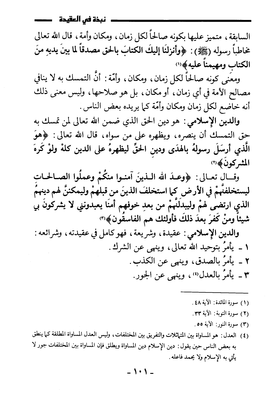 (¬1) العدل: هو المساواة بين المتماثلات والتفريق بين المختلفات، وليس العدل المساواة المطلقة كما ينطق به بعض الناس حين يقول: دين الإسلام دين المساواة ويطلق فإن المساواة بين المختلفات جور لا يأتي به الإسلام ولا يحمد فاعله.