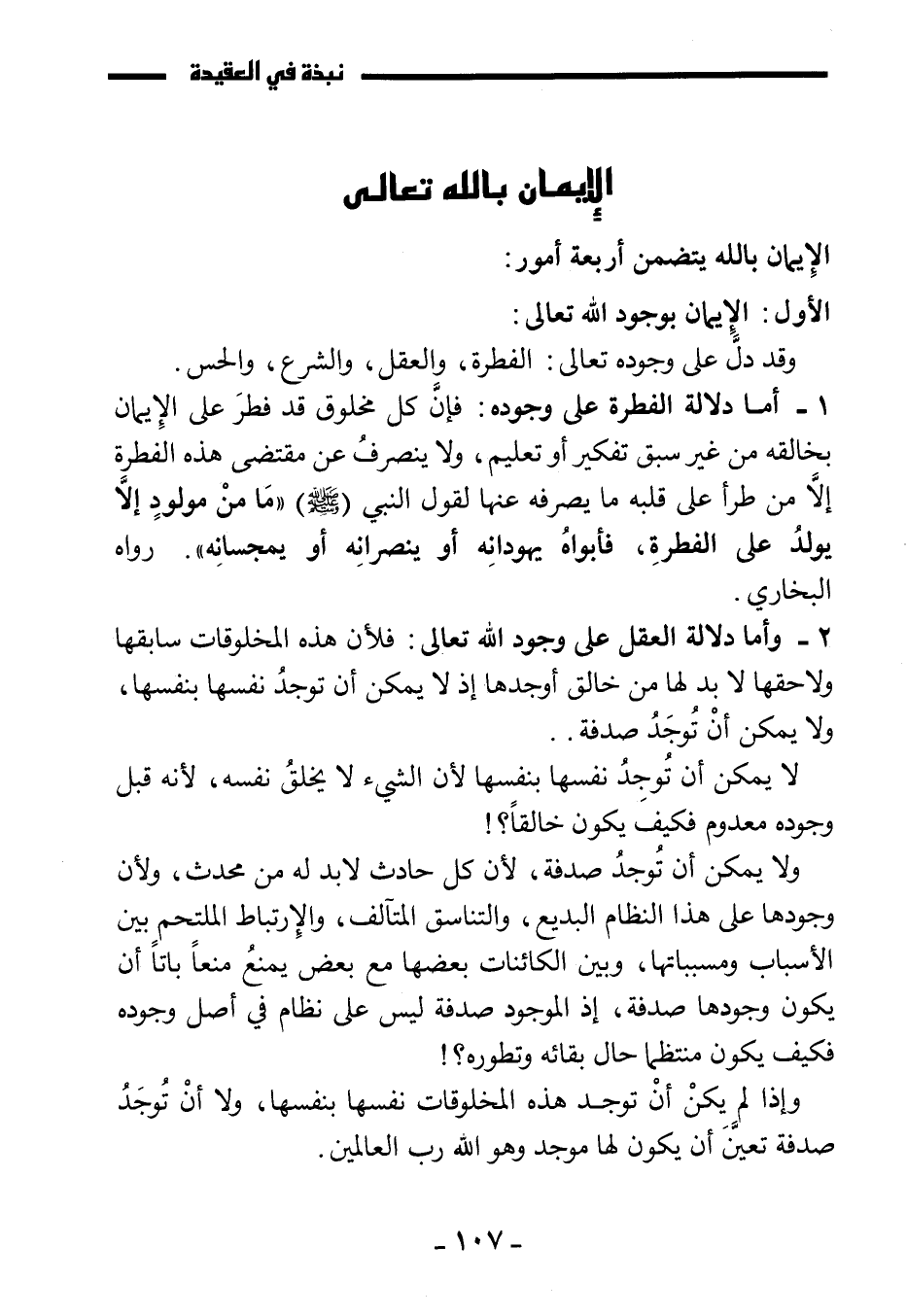 1 - أما دلالة الفطرة على وجوده: فإن كل مخلوق قد فطر على الإيمان بخالقه من غير سبق تفكير أو تعليم، ولا ينصرف عن مقتضى هذه الفطرة إلا من طرأ على قلبه ما يصرفه عنها لقول النبي (صَلَّى اللَّهُ عَلَيْهِ وَسَلَّمَ) «ما من مولود إلا يولد على الفطرة، فأبواه يهودانه أو ينصرانه أو يمجسانه» . رواه البخاري.