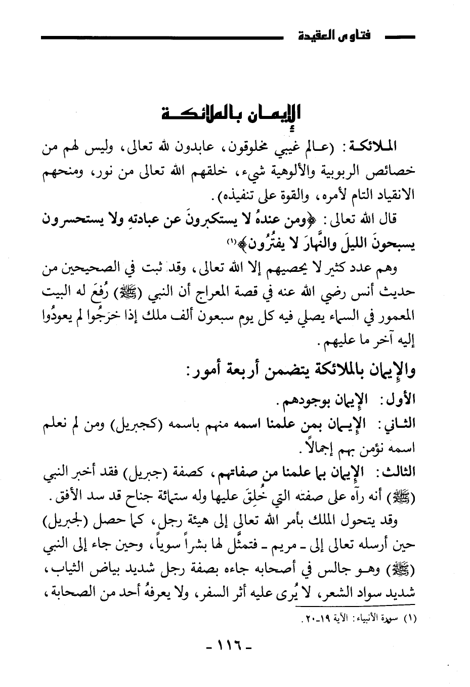 الملائكة: (عالم غيبي مخلوقون، عابدون لله تعالى، وليس لهم من خصائص الربوبية والألوهية شيء، خلقهم الله تعالى من نور، ومنحهم الانقياد التام لأمره، والقوة على تنفيذه) .