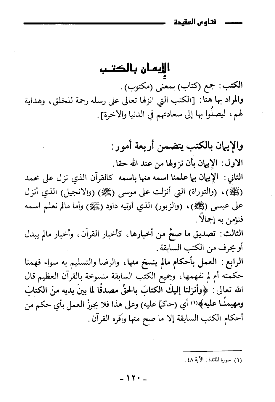 الثاني: الإيمان بما علمنا اسمه منها باسمه كالقرآن الذي نزل على محمد صَلَّى اللَّهُ عَلَيْهِ وَسَلَّمَ، (والتوراة) التي أنزلت على موسى صَلَّى اللَّهُ عَلَيْهِ وَسَلَّمَ (والإنجيل) الذي أنزل على عيسى صَلَّى اللَّهُ عَلَيْهِ وَسَلَّمَ، (والزبور) الذي أوتيه داود صَلَّى اللَّهُ عَلَيْهِ وَسَلَّمَ، وأما ما لم نعلم اسمه فنؤمن به إجمالا.