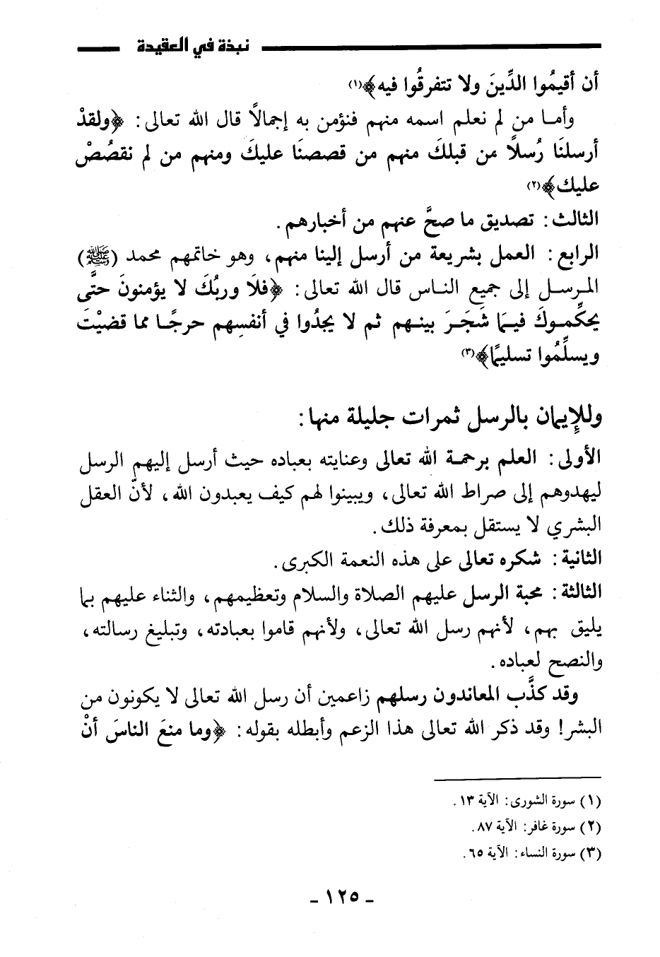 الرابع: العمل بشريعة من أرسل إلينا منهم، وهو خاتمهم محمد صَلَّى اللَّهُ عَلَيْهِ وَسَلَّمَ المرسل إلى جميع الناس قال الله تعالى: {فَلَا وَرَبِّكَ لَا يُؤْمِنُونَ حَتَّى يُحَكِّمُوكَ فِيمَا شَجَرَ بَيْنَهُمْ ثُمَّ لَا يَجِدُوا فِي أَنْفُسِهِمْ حَرَجًا مِمَّا قَضَيْتَ وَيُسَلِّمُوا تَسْلِيمًا} .