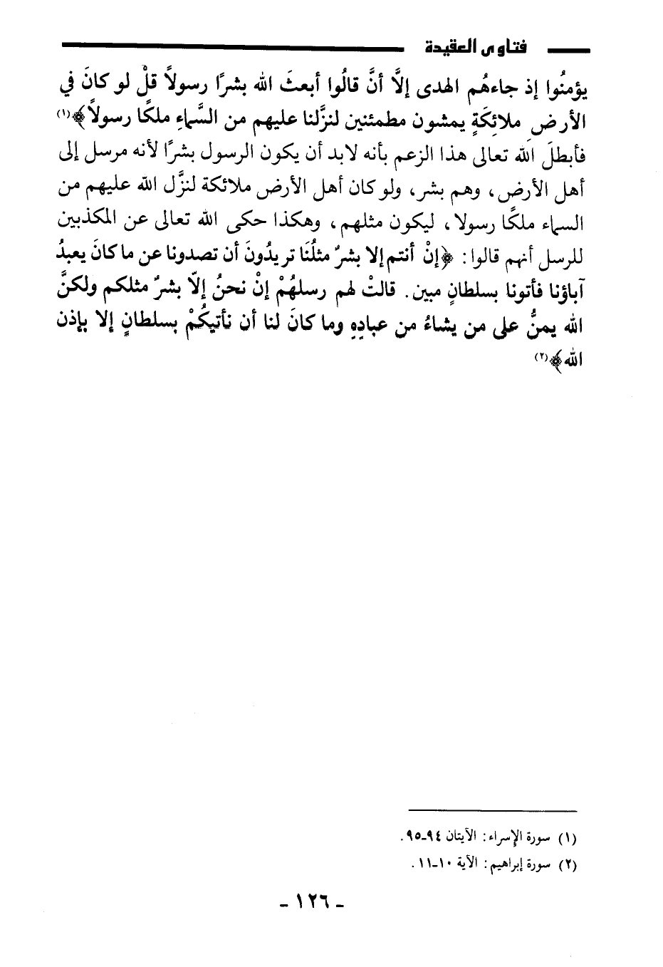 {وَمَا مَنَعَ النَّاسَ أَنْ يُؤْمِنُوا إِذْ جَاءَهُمُ الْهُدَى إِلَّا أَنْ قَالُوا أَبَعَثَ اللَّهُ بَشَرًا رَسُولًا قُلْ لَوْ كَانَ فِي الْأَرْضِ مَلَائِكَةٌ يَمْشُونَ مُطْمَئِنِّينَ لَنَزَّلْنَا عَلَيْهِمْ مِنَ السَّمَاءِ مَلَكًا رَسُولًا} فأبطل الله تعالى هذا الزعم بأنه لا بد أن يكون الرسول بشرا؛ لأنه مرسل إلى أهل الأرض، وهم بشر، ولو كان أهل الأرض ملائكة لنزل الله عليهم من السماء ملكا رسولا، ليكون مثلهم، وهكذا حكى الله تعالى عن المكذبين للرسل أنهم قالوا: {إِنْ أَنْتُمْ إِلَّا بَشَرٌ مِثْلُنَا تُرِيدُونَ أَنْ تَصُدُّونَا عَمَّا كَانَ يَعْبُدُ آبَاؤُنَا فَأْتُونَا بِسُلْطَانٍ مُبِينٍ قَالَتْ لَهُمْ رُسُلُهُمْ إِنْ نَحْنُ إِلَّا بَشَرٌ مِثْلُكُمْ وَلَكِنَّ اللَّهَ يَمُنُّ عَلَى مَنْ يَشَاءُ مِنْ عِبَادِهِ وَمَا كَانَ لَنَا أَنْ نَأْتِيَكُمْ بِسُلْطَانٍ إِلَّا بِإِذْنِ اللَّهِ} .
