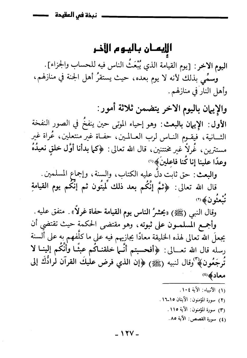 الأول: الإيمان بالبعث: وهو إحياء الموتى حين ينفخ في الصور النفخة الثانية، فيقوم الناس لرب العالمين، حفاة غير منتعلين، عراة غير مستترين، غرلا غير مختتنين، قال الله تعالى: {كَمَا بَدَأْنَا أَوَّلَ خَلْقٍ نُعِيدُهُ وَعْدًا عَلَيْنَا إِنَّا كُنَّا فَاعِلِينَ} .
