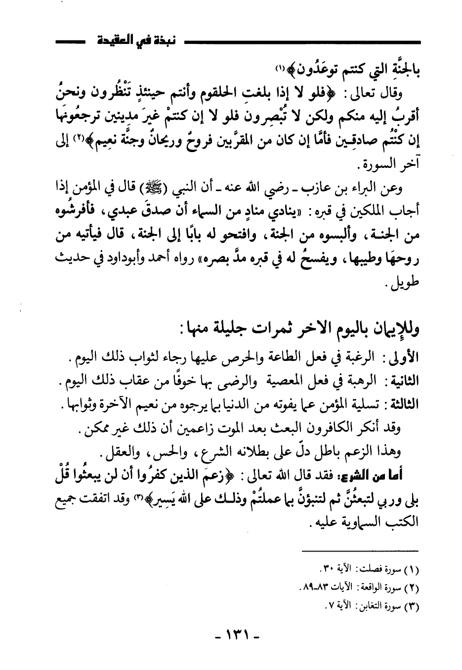 وقال تعالى: {فَلَوْلَا إِذَا بَلَغَتِ الْحُلْقُومَ وَأَنْتُمْ حِينَئِذٍ تَنْظُرُونَ وَنَحْنُ أَقْرَبُ إِلَيْهِ مِنْكُمْ وَلَكِنْ لَا تُبْصِرُونَ فَلَوْلَا إِنْ كُنْتُمْ غَيْرَ مَدِينِينَ تَرْجِعُونَهَا إِنْ كُنْتُمْ صَادِقِينَ فَأَمَّا إِنْ كَانَ مِنَ الْمُقَرَّبِينَ فَرَوْحٌ وَرَيْحَانٌ وَجَنَّةُ نَعِيمٍ} إلى آخر السورة.