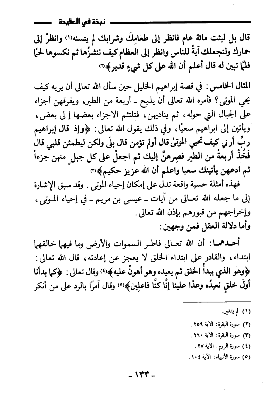 {أَوْ كَالَّذِي مَرَّ عَلَى قَرْيَةٍ وَهِيَ خَاوِيَةٌ عَلَى عُرُوشِهَا قَالَ أَنَّى يُحْيِي هَذِهِ اللَّهُ بَعْدَ مَوْتِهَا فَأَمَاتَهُ اللَّهُ مِائَةَ عَامٍ ثُمَّ بَعَثَهُ قَالَ كَمْ لَبِثْتَ قَالَ لَبِثْتُ يَوْمًا أَوْ بَعْضَ يَوْمٍ قَالَ بَلْ لَبِثْتَ مِائَةَ عَامٍ فَانْظُرْ إِلَى طَعَامِكَ وَشَرَابِكَ لَمْ يَتَسَنَّهْ (¬1) وَانْظُرْ إِلَى حِمَارِكَ وَلِنَجْعَلَكَ آيَةً لِلنَّاسِ وَانْظُرْ إِلَى الْعِظَامِ كَيْفَ نُنْشِزُهَا ثُمَّ نَكْسُوهَا لَحْمًا فَلَمَّا تَبَيَّنَ لَهُ قَالَ أَعْلَمُ أَنَّ اللَّهَ عَلَى كُلِّ شَيْءٍ قَدِيرٌ} .