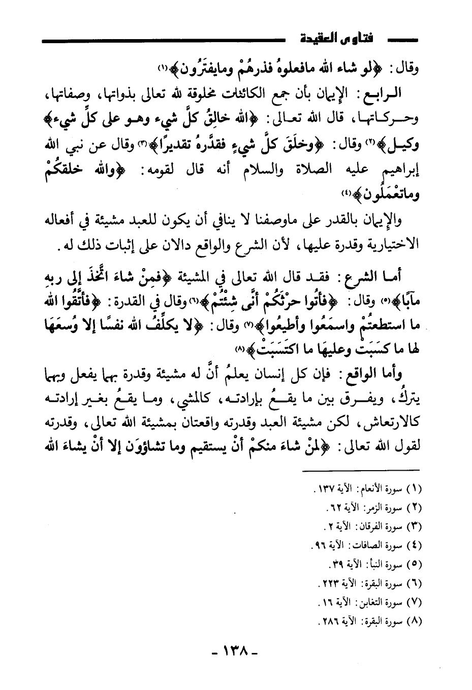 وأما الواقع: فإن كل إنسان يعلم أن له مشيئة وقدرة بهما يفعل وبهما يترك، ويفرق بين ما يقع بإرادته كالمشي، وما يقع بغير إرادته كالارتعاش، لكن مشيئة العبد وقدرته واقعتان بمشيئة الله تعالى وقدرته لقول الله تعالى: {لِمَنْ شَاءَ مِنْكُمْ أَنْ يَسْتَقِيمَ وَمَا تَشَاءُونَ إِلَّا أَنْ يَشَاءَ اللَّهُ رَبُّ الْعَالَمِينَ}