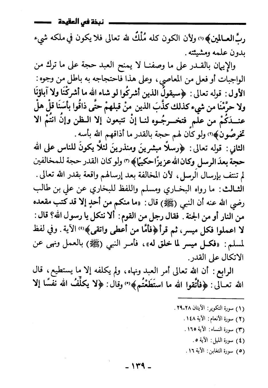 الرابع: أن الله تعالى أمر العبد ونهاه، ولم يكلفه إلا ما يستطيع، قال الله تعالى: {فَاتَّقُوا اللَّهَ مَا اسْتَطَعْتُمْ} ، وقال: {لَا يُكَلِّفُ اللَّهُ نَفْسًا إِلَّا وُسْعَهَا}