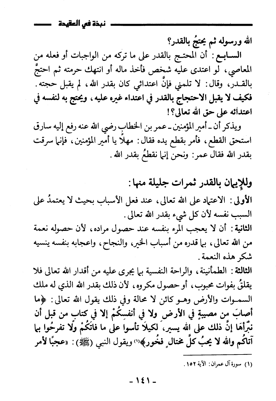 ويذكر أن أمير المؤمنين عمر بن الخطاب رضي الله عنه رفع إليه سارق استحق القطع، فأمر بقطع يده فقال: مهلا يا أمير المؤمنين، فإنما سرقت بقدر الله، فقال عمر: ونحن إنما نقطع بقدر الله.