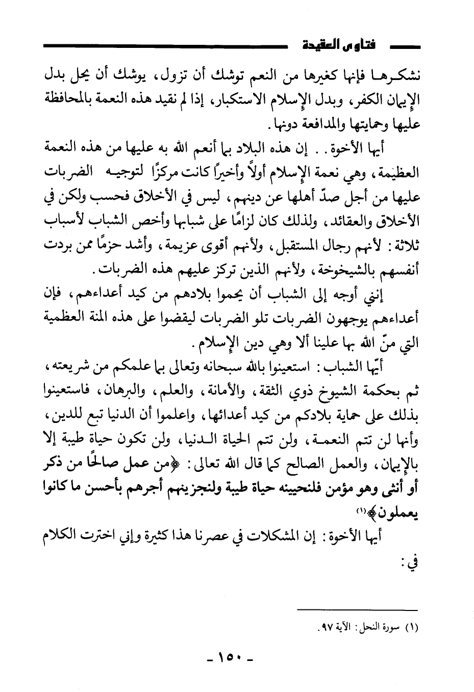 أيها الشباب: استعينوا بالله سبحانه وتعالى بما علمكم من شريعته، ثم بحكمة الشيوخ ذوي الثقة والأمانة والعلم والبرهان، فاستعينوا بذلك على حماية بلادكم من كيد أعدائها، واعلموا أن الدنيا تبع للدين، وأنها لن تتم النعمة، ولن تتم الحياة الدنيا، ولن تكون حياة طيبة، إلا بالإيمان والعمل الصالح كما قال الله تعالى: {مَنْ عَمِلَ صَالِحًا مِنْ ذَكَرٍ أَوْ أُنْثَى وَهُوَ مُؤْمِنٌ فَلَنُحْيِيَنَّهُ حَيَاةً طَيِّبَةً وَلَنَجْزِيَنَّهُمْ أَجْرَهُمْ بِأَحْسَنِ مَا كَانُوا يَعْمَلُونَ} .