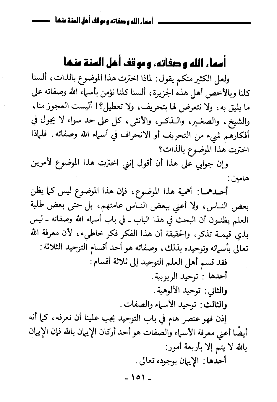 ولعل الكثير منكم يقول: لماذا اخترت هذا الموضوع بالذات؟ ألسنا كلنا، وبالأخص أهل هذه الجزيرة، ألسنا كلنا نؤمن بأسماء الله وصفاته على ما يليق به، ولا نتعرض لها بتحريف ولا تعطيل؟ أليست العجوز منا والشيخ والصغير والذكر والأنثى، كل على حدٍ سواء لا يجول في أفكارهم شيء من التحريف أو الانحراف في أسماء الله وصفاته؟ فلماذا اخترت هذا الموضوع بالذات؟