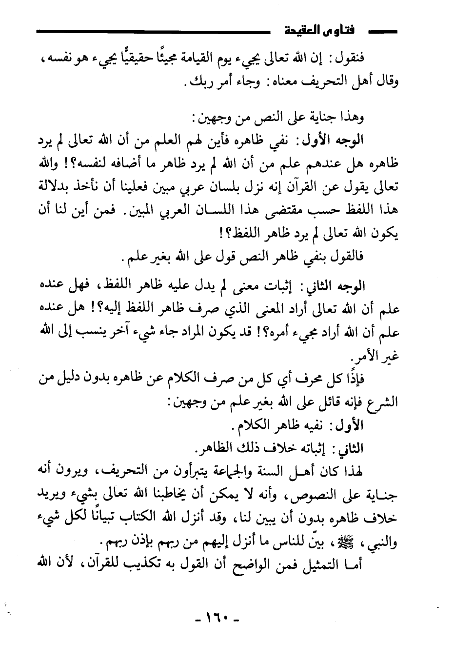 لهذا كان أهل السنة والجماعة يتبرءون من التحريف، ويرون أنه جناية على النصوص، وأنه لا يمكن أن يخاطبنا الله تعالى بشيء ويريد خلاف ظاهره بدون أن يبين لنا، وقد أنزل الله الكتاب تبيانا لكل شيء، والنبي صَلَّى اللَّهُ عَلَيْهِ وَسَلَّمَ بين للناس ما أنزل إليهم من ربهم بإذن ربهم.
