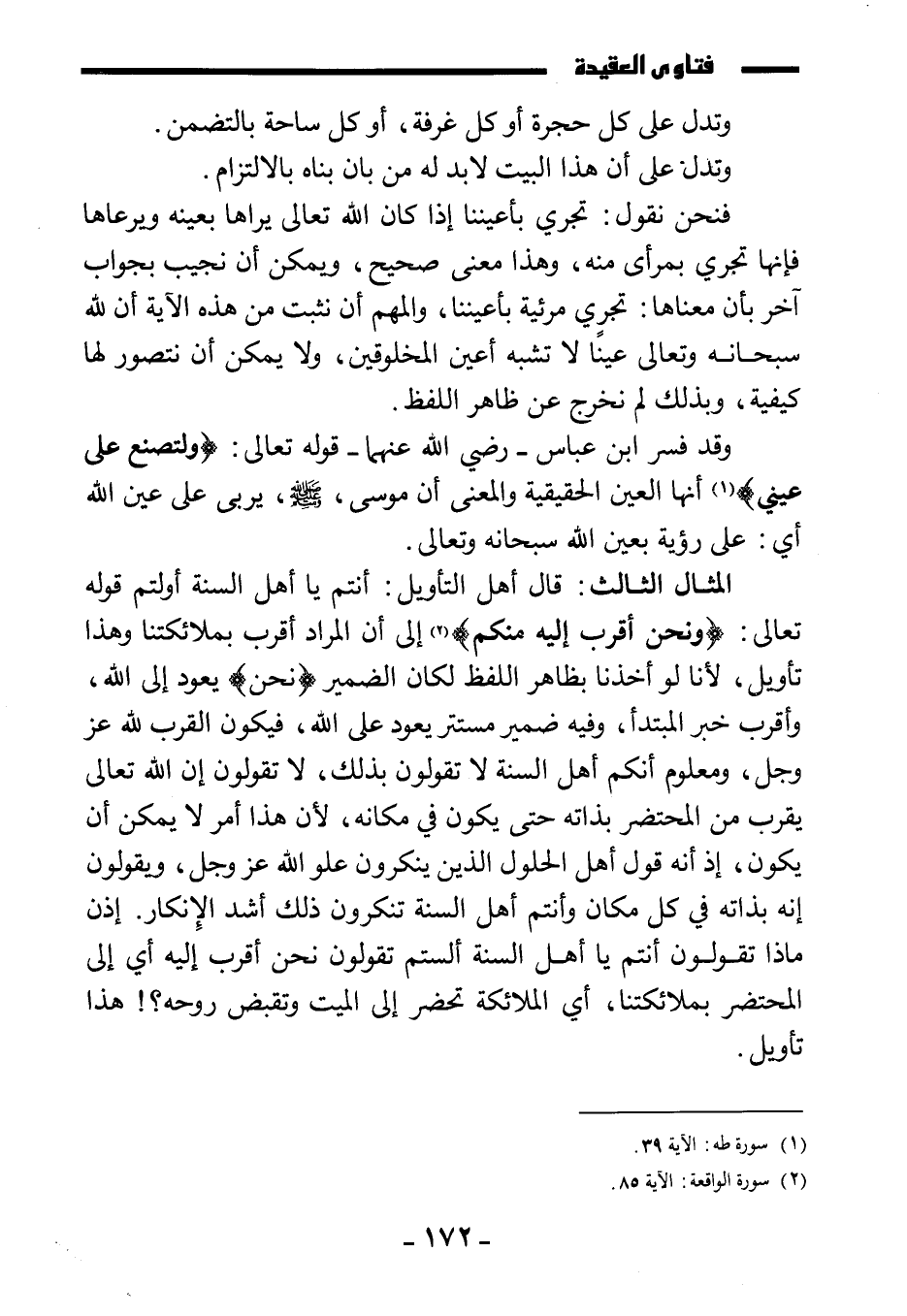المثال الثالث: قال أهل التأويل: أنتم يا أهل السنة أولتم قوله تعالى: {وَنَحْنُ أَقْرَبُ إِلَيْهِ مِنْكُمْ} إلى أن المراد أقرب بملائكتنا وهذا تأويل؛ لأنا لو أخذنا بظاهر اللفظ لكان الضمير نحن يعود إلى الله، وأقرب خبر المبتدأ، وفيه ضمير مستتر يعود على الله، فيكون القرب لله عز وجل، ومعلوم أنكم أهل السنة لا تقولون بذلك، لا تقولون: إن الله تعالى يقرب من المحتضر بذاته حتى يكون في مكانه؛ لأن هذا أمر لا يمكن أن يكون، إذ إنه قول أهل الحلول الذين ينكرون علو الله عز وجل، ويقولون: إنه بذاته في كل مكان، وأنتم أهل السنة تنكرون ذلك أشد الإنكار، إذن ماذا تقولون أنتم يا أهل السنة؟ ألستم تقولون: نحن أقرب إليه أي إلى المحتضر بملائكتنا، أي الملائكة تحضر إلى الميت وتقبض روحه؟ ! هذا تأويل.