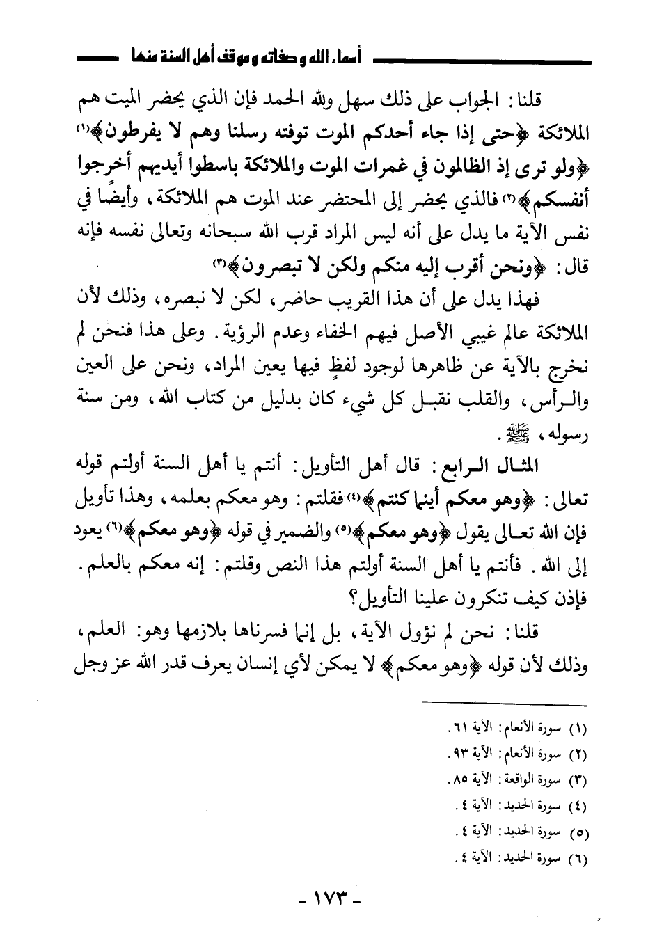 المثال الرابع: قال أهل التأويل: أنتم يا أهل السنة أولتم قوله تعالى: {وَهُوَ مَعَكُمْ أَيْنَ مَا كُنْتُمْ} ، فقلتم: وهو معكم بعلمه، وهذا تأويل، فإن الله تعالى يقول: {وَهُوَ مَعَكُمْ} ، والضمير في قوله: {وَهُوَ مَعَكُمْ} يعود إلى الله، فأنتم يا أهل السنة أولتم هذا النص وقلتم: إنه معكم بالعلم، فإذن كيف تنكرون علينا التأويل؟