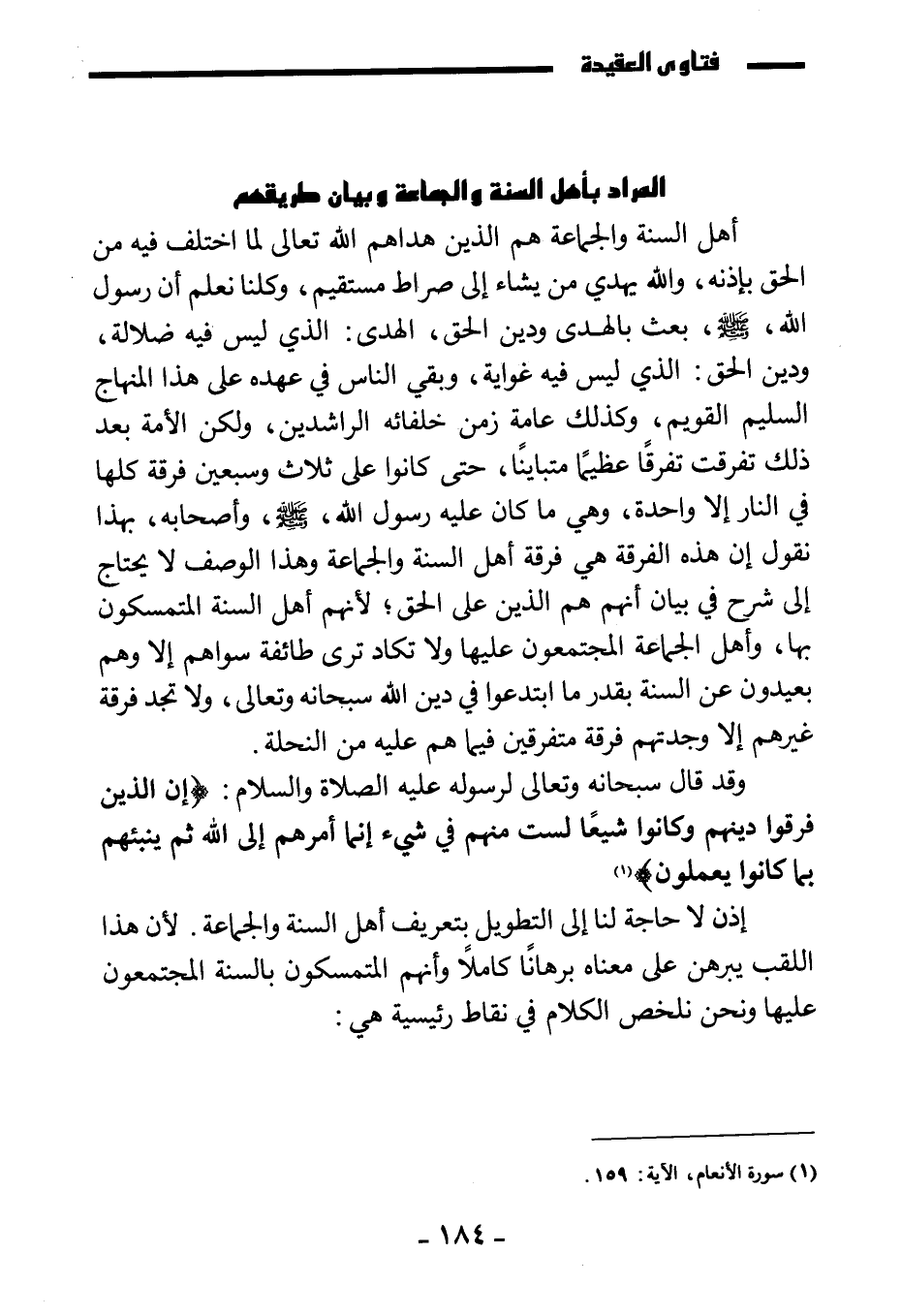 وقد قال سبحانه وتعالى لرسوله عليه الصلاة والسلام: {إِنَّ الَّذِينَ فَرَّقُوا دِينَهُمْ وَكَانُوا شِيَعًا لَسْتَ مِنْهُمْ فِي شَيْءٍ إِنَّمَا أَمْرُهُمْ إِلَى اللَّهِ ثُمَّ يُنَبِّئُهُمْ بِمَا كَانُوا يَفْعَلُونَ} .