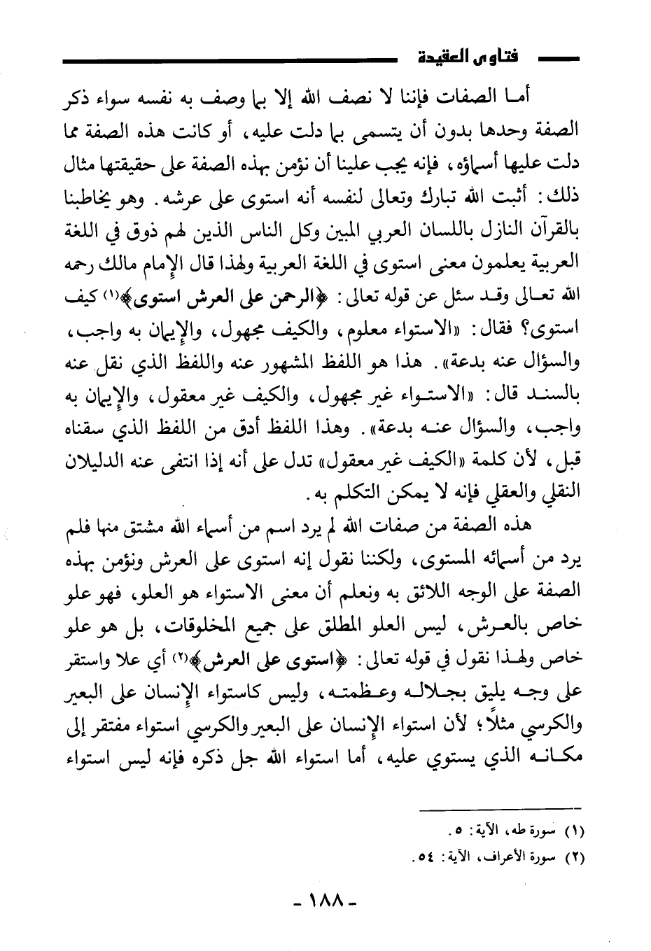 أما الصفات فإننا لا نصف الله إلا بما وصف به نفسه سواء ذكر الصفة وحدها بدون أن يتسمى بما دلت عليه، أو كانت هذه الصفة مما دلت عليها أسماؤه، فإنه يجب علينا أن نؤمن بهذه الصفة على حقيقتها، مثال ذلك: أثبت الله تبارك وتعالى لنفسه أنه استوى على عرشه، وهو يخاطبنا بالقرآن النازل باللسان العربي المبين، وكل الناس الذين لهم ذوق في اللغة العربية يعلمون معنى استوى في اللغة العربية، ولهذا قال الإمام مالك رحمه الله تعالى وقد سئل عن قوله تعالى: {الرَّحْمَنُ عَلَى الْعَرْشِ اسْتَوَى} كيف استوى؟ فقال: " الاستواء معلوم، والكيف مجهول، والإيمان به واجب، والسؤال عنه بدعة "، هذا هو اللفظ المشهور عنه، واللفظ الذي نقل عنه بالسند قال: " الاستواء غير مجهول، والكيف غير معقول، والإيمان به واجب، والسؤال عنه بدعة "، وهذا اللفظ أدق من اللفظ الذي سقناه قبل؛ لأن كلمة " الكيف غير معقول " تدل على أنه إذا انتفى عنه الدليلان النقلي والعقلي فإنه لا يمكن التكلم به.