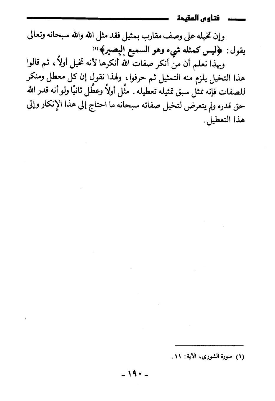 وإن تخيله على وصف مقارب بمثيل فقد مثل الله، والله سبحانه وتعالى يقول: {لَيْسَ كَمِثْلِهِ شَيْءٌ وَهُوَ السَّمِيعُ الْبَصِيرُ} .