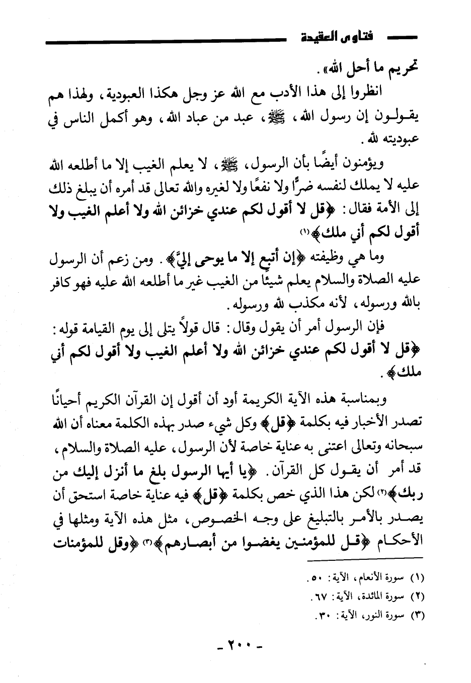 ويؤمنون أيضا بأن الرسول صَلَّى اللَّهُ عَلَيْهِ وَسَلَّمَ لا يعلم الغيب إلا ما أطلعه الله عليه، لا يملك لنفسه ضرا ولا نفعا ولا لغيره، والله تعالى قد أمره أن يبلغ ذلك إلى الأمة فقال: {قُلْ لَا أَقُولُ لَكُمْ عِنْدِي خَزَائِنُ اللَّهِ وَلَا أَعْلَمُ الْغَيْبَ وَلَا أَقُولُ لَكُمْ إِنِّي مَلَكٌ} .