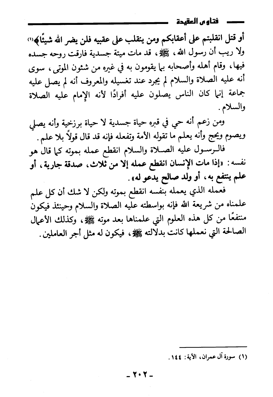 فالرسول عليه الصلاة والسلام انقطع عمله بموته كما قال هو نفسه: «إذا مات الإنسان انقطع عمله إلا من ثلاث: صدقة جارية، أو علم ينتفع به، أو ولد صالح يدعو له» .