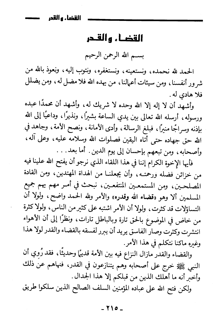 فأيها الإخوة الكرام إننا في هذا اللقاء الذي نرجو أن يفتح الله علينا فيه من خزائن فضله ورحمته، وأن يجعلنا من الهداة المهتدين، ومن القادة المصلحين، ومن المستمعين المنتفعين، نبحث في أمر مهم يهم جميع المسلمين، ألا وهو " قضاء الله وقدره "، والأمر ولله الحمد واضح، ولولا أن التساؤلات قد كثرت، ولولا أن الأمر اشتبه على كثير من الناس، ولولا كثرة من خاض في الموضوع بالحق تارة وبالباطل تارات، ونظرا إلى أن الأهواء انتشرت وكثرت، وصار الفاسق يريد أن يبرر لفسقه بالقضاء والقدر، لولا هذا وغيره ما كنا نتكلم في هذا الأمر.