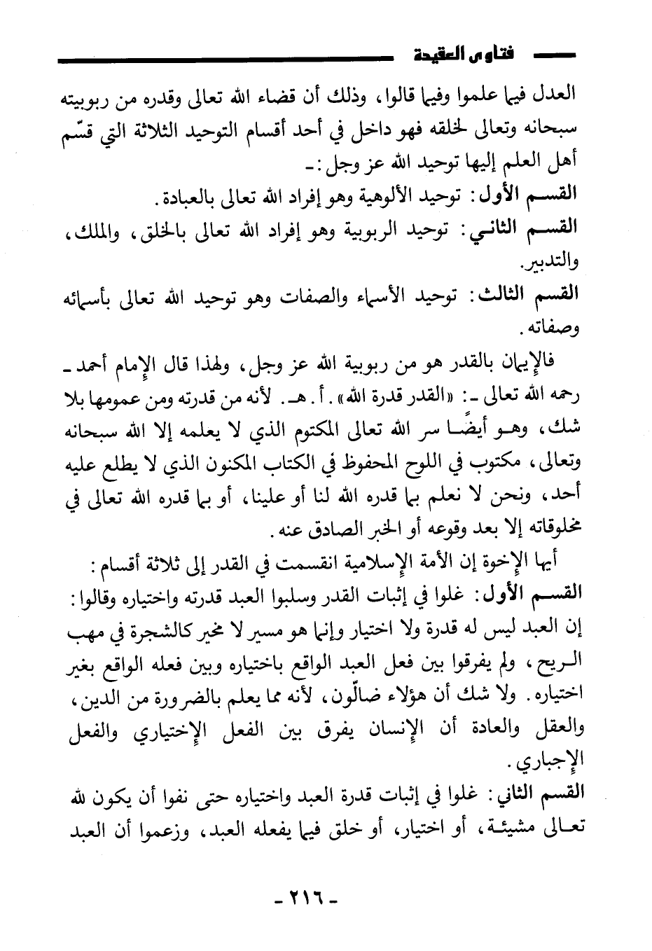 العدل فيما عملوا وفيما قالوا؛ وذلك أن قضاء الله تعالى وقدره من ربوبيته سبحانه وتعالى لخلقه، فهو داخل في أحد أقسام التوحيد الثلاثة التي قسم أهل العلم إليها توحيد الله عز وجل:
