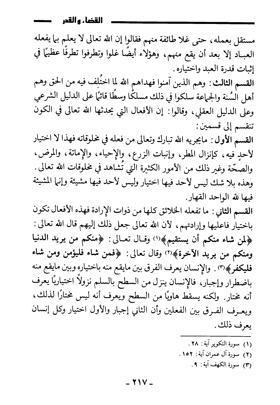 القسم الثاني: ما تفعله الخلائق كلها من ذوات الإرادة فهذه الأفعال تكون باختيار فاعليها وإرادتهم؛ لأن الله تعالى جعل ذلك إليهم، قال الله تعالى: {لِمَنْ شَاءَ مِنْكُمْ أَنْ يَسْتَقِيمَ} ، وقال تعالى: {مِنْكُمْ مَنْ يُرِيدُ الدُّنْيَا وَمِنْكُمْ مَنْ يُرِيدُ الْآخِرَةَ} ، وقال تعالى: {فَمَنْ شَاءَ فَلْيُؤْمِنْ وَمَنْ شَاءَ فَلْيَكْفُرْ} ، والإنسان يعرف الفرق بين ما يقع منه باختياره وبين ما يقع منه باضطرار وإجبار، فالإنسان ينزل من السطح بالسلم نزولا اختياريا يعرف أنه مختار، ولكنه يسقط هاويا من السطح ويعرف أنه ليس مختارا لذلك، ويعرف الفرق بين الفعلين، وأن الثاني إجبار والأول اختيار، وكل إنسان يعرف ذلك.