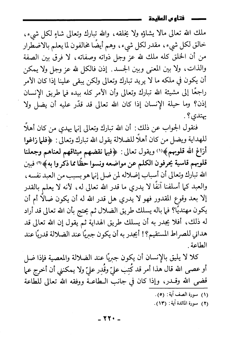 ملك الله تعالى ما لا يشاؤه ولا يخلقه، والله تبارك وتعالى شاءٍ لكل شيء، خالق لكل شيء، مقدر لكل شيء، وهم أيضا مخالفون لما يعلم بالاضطرار من أن الخلق كله ملك لله عز وجل ذواته وصفاته، لا فرق بين الصفة والذات، ولا بين المعنى وبين الجسد، إذن فالكل لله عز وجل، ولا يمكن أن يكون في ملكه ما لا يريد تبارك وتعالى، ولكن يبقى علينا إذا كان الأمر راجعا إلى مشيئة الله تبارك وتعالى، وأن الأمر كله بيده، فما طريق الإنسان إذن؟ وما حيلة الإنسان إذا كان الله تعالى قد قدر عليه أن يضل ولا يهتدي؟