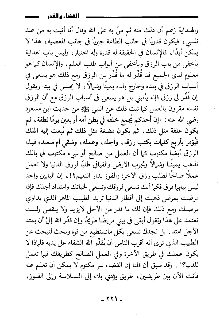 فهذا الرزق أيضا مكتوب كما أن العمل من صالح أو سيئ مكتوب، فما بالك تذهب يمينا وشمالا وتجوب الأرض والفيافي طلبا لرزق الدنيا، ولا تعمل عملا صالحا لطلب رزق الآخرة والفوز بدار النعيم؟ ! إن البابين واحد ليس بينهما فرق، فكما أنك تسعى لرزقك وتسعى لحياتك وامتداد أجلك فإذا مرضت بمرض ذهبت إلى أقطار الدنيا تريد الطبيب الماهر الذي يداوي مرضك، ومع ذلك فإن لك ما قدر من الأجل لا يزيد ولا ينقص، ولست تعتمد على هذا وتقول: أبقى في بيتي مريضا طريحا وإن قدر الله لي أن يمتد الأجل امتد، بل نجدك تسعى بكل ما تستطيع من قوة وبحث لتبحث عن الطبيب الذي ترى أنه أقرب الناس أن يقدر الله الشفاء على يديه، فلماذا لا يكون عملك في طريق الآخرة وفي العمل الصالح كطريقك فيما تعمل للدنيا؟ ! وقد سبق أن قلنا: إن القضاء سر مكتوم لا يمكن أن تعلم عنه، فأنت الآن بين طريقين: طريق يؤدي بك إلى السلامة وإلى الفوز