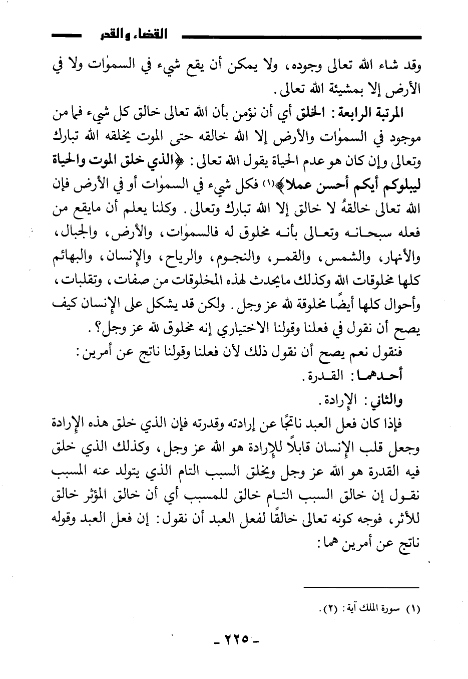 فإذا كان فعل العبد ناتجا عن إرادته وقدرته فإن الذي خلق هذه الإرادة وجعل قلب الإنسان قابلا للإرادة هو الله عز وجل، وكذلك الذي خلق فيه القدرة هو الله عز وجل ويخلق السبب التام الذي يتولد عنه المسبب. نقول: إن خلق السبب التام خالق للمسبب أي إن خالق المؤثر خالق للأثر، فوجه كونه تعالى خالقا لفعل العبد أن نقول إن فعل العبد وقوله ناتج عن أمرين هما: