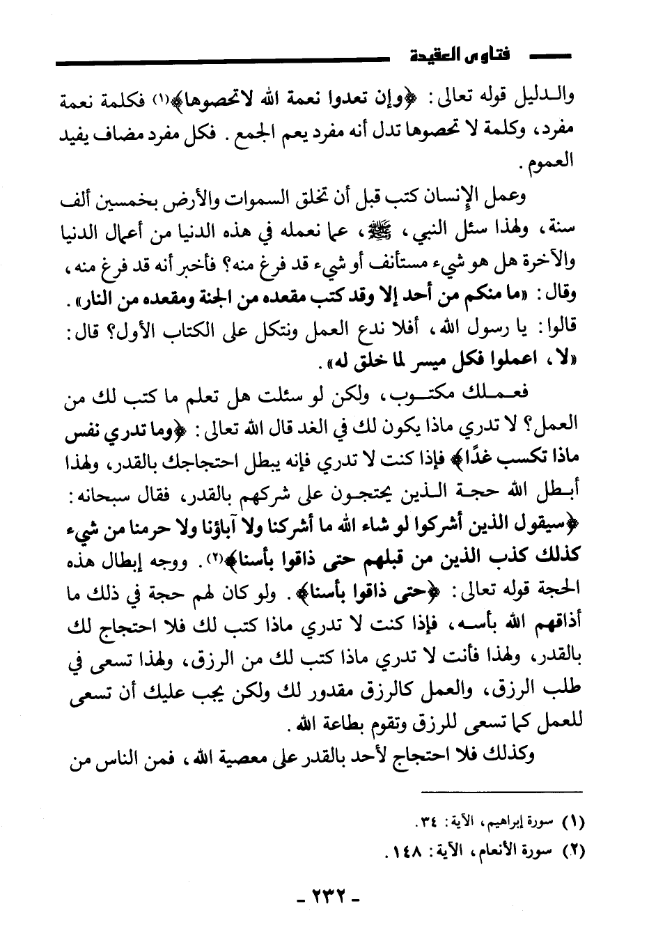 فعملك مكتوب، ولكن لو سئلت هل تعلم ما كتب لك من العمل؟ لا تدري ماذا يكون لك في الغد قال الله تعالى: {وَمَا تَدْرِي نَفْسٌ مَاذَا تَكْسِبُ غَدًا} فإذا كنت لا تدري فإنه يبطل احتجاجك بالقدر، ولهذا أبطل الله حجة الذين يحتجون على شركهم بالقدر، فقال سبحانه: {سَيَقُولُ الَّذِينَ أَشْرَكُوا لَوْ شَاءَ اللَّهُ مَا أَشْرَكْنَا وَلَا آبَاؤُنَا وَلَا حَرَّمْنَا مِنْ شَيْءٍ كَذَلِكَ كَذَّبَ الَّذِينَ مِنْ قَبْلِهِمْ حَتَّى ذَاقُوا بَأْسَنَا} ووجه إبطال هذه الحجة قوله تعالى: {حَتَّى ذَاقُوا بَأْسَنَا} ولو كان لهم حجة في ذلك ما أذاقهم الله بأسه، فإذا كنت لا تدري ماذا كتب لك فلا احتجاج لك بالقدر، ولهذا فأنت لا تدري ماذا كتب لك من الرزق، ولهذا تسعى في طلب الرزق، والعمل كالرزق مقدور لك ولكن يجب عليك أن تسعى للعمل كما تسعى للرزق وتقوم بطاعة الله. وكذلك فلا احتجاج لأحد بالقدر على معصية الله، فمن الناس من