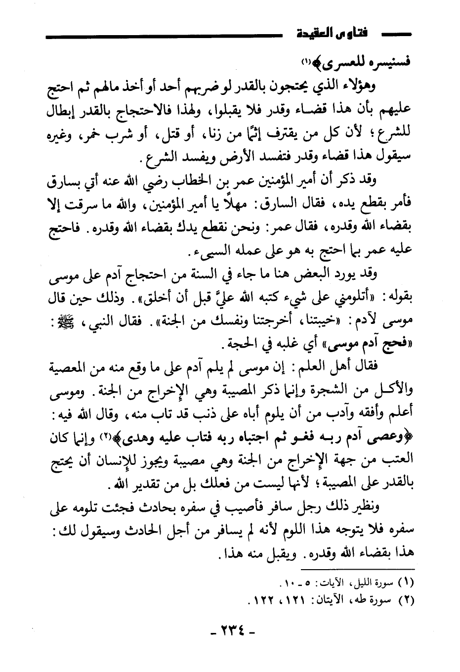 وقد ذكر أن أمير المؤمنين عمر بن الخطاب رضي الله عنه أتي بسارق فأمر بقطع يده، فقال السارق: مهلا يا أمير المؤمنين، والله ما سرقت إلا بقضاء الله وقدره، فقال عمر: ونحن نقطع يدك بقضاء الله وقدره. فاحتج عليه عمر بما احتج به هو على عمله السيئ.