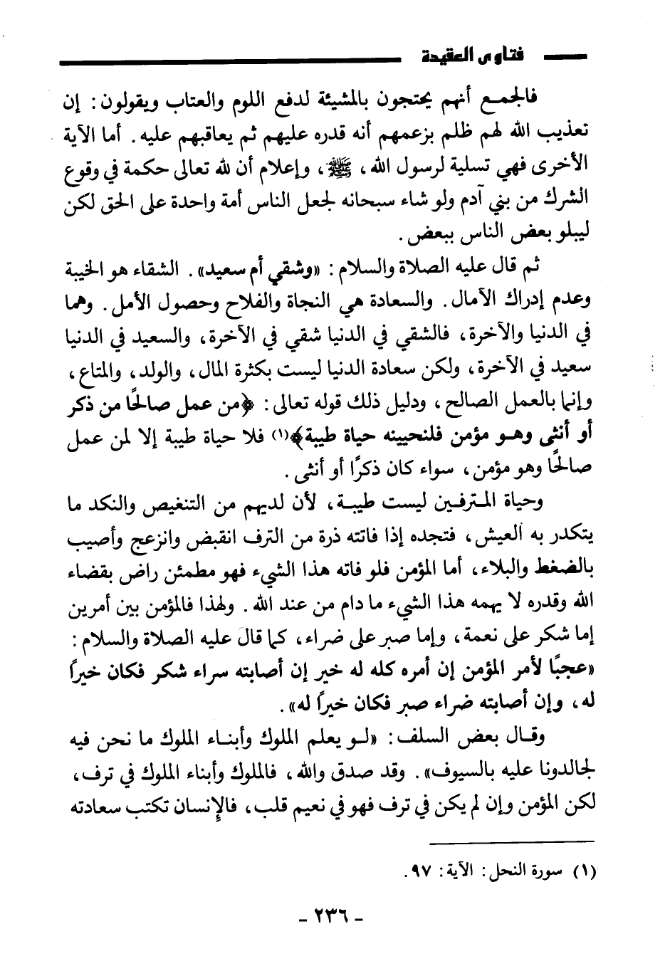 وحياة المترفين ليست طيبة؛ لأن لديهم من التنغيص والنكد ما يتكدر به العيش، فتجده إذا فاتته ذرة من الترف انقبض وانزعج وأصيب بالضغط والبلاء، أما المؤمن فلو فاته هذا الشيء فهو مطمئن راض بقضاء الله وقدره، لا يهمه هذا الشيء ما دام من عند الله. ولهذا فالمؤمن بين أمرين إما شكر على نعمة، وإما صبر على ضراء، كما قال عليه الصلاة والسلام: «عجبا لأمر المؤمن إن أمره كله له خير إن أصابته سراء شكر فكان خيرا له، وإن أصابته ضراء صبر فكان خيرا له» .