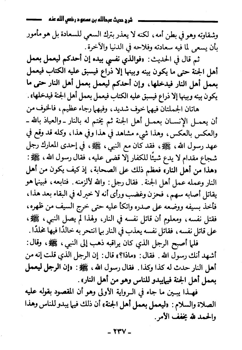 ثم قال في الحديث: «فوالذي نفسي بيده إن أحدكم ليعمل بعمل أهل الجنة حتى ما يكون بينه وبينها إلا ذراع فيسبق عليه الكتاب فيعمل بعمل أهل النار فيدخلها، وإن أحدكم ليعمل بعمل أهل النار حتى ما يكون بينه وبينها إلا ذراع فيسبق عليه الكتاب فيعمل بعمل أهل الجنة فيدخلها» .