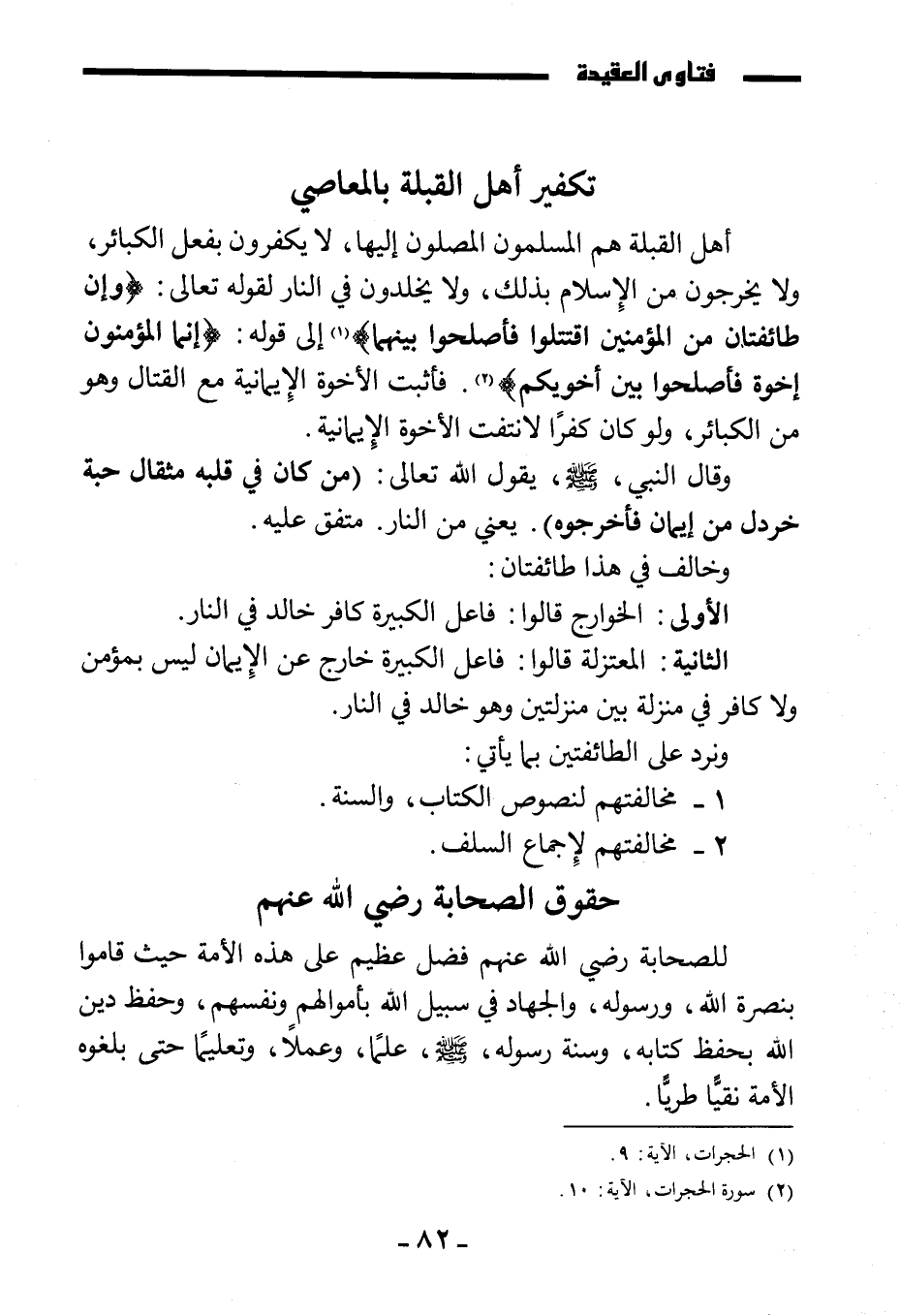 أهل القبلة هم المسلمون المصلون إليها، لا يكفرون بفعل الكبائر، ولا يخرجون من الإسلام بذلك، ولا يخلدون في النار لقوله تعالى: {وَإِنْ طَائِفَتَانِ مِنَ الْمُؤْمِنِينَ اقْتَتَلُوا فَأَصْلِحُوا بَيْنَهُمَا} إلى قوله: {إِنَّمَا الْمُؤْمِنُونَ إِخْوَةٌ فَأَصْلِحُوا بَيْنَ أَخَوَيْكُمْ} . فأثبت الأخوة الإيمانية مع القتال وهو من الكبائر، ولو كان كفرا لانتفت الأخوة الإيمانية.