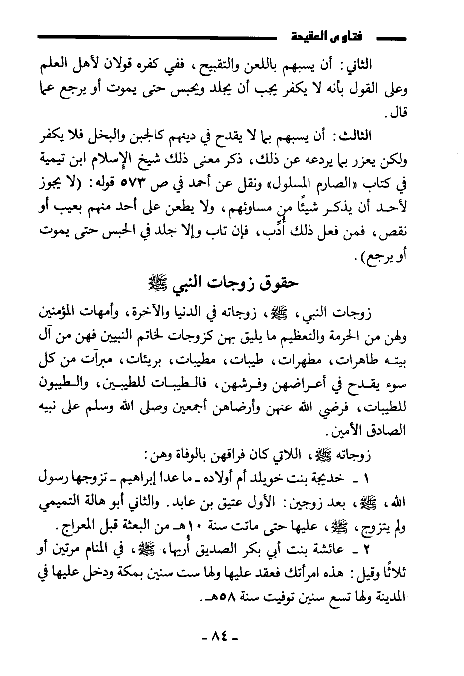 زوجات النبي، صَلَّى اللَّهُ عَلَيْهِ وَسَلَّمَ، زوجاته في الدنيا والآخرة، وأمهات المؤمنين ولهن من الحرمة والتعظيم ما يليق بهن كزوجات لخاتم النبيين فهن من آل بيته طاهرات، مطهرات، طيبات، مطيبات، بريئات، مبرآت من كل سوء يقدح في أعراضهن وفرشهن، فالطيبات للطيبين، والطيبون للطيبات، فرضي الله عنهن وأرضاهن أجمعين وصلى الله وسلم على نبيه الصادق الأمين.